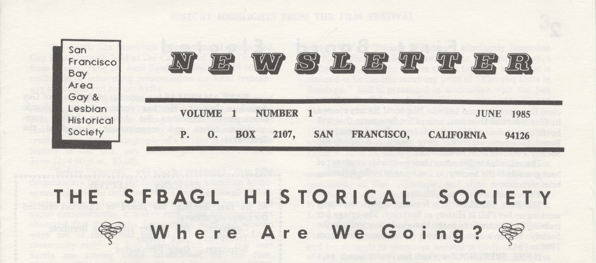OurStories newsletter, #GLBT-PER. All issues of OurStories from 1985-2007. OurStories was the newsletter of the GLBT Historical Society. The newsletter tracks the progression of programs and organizational structuring at GLBTHS in addition to acting as a forum for public history work about archival collections and other projects by members of the Society.