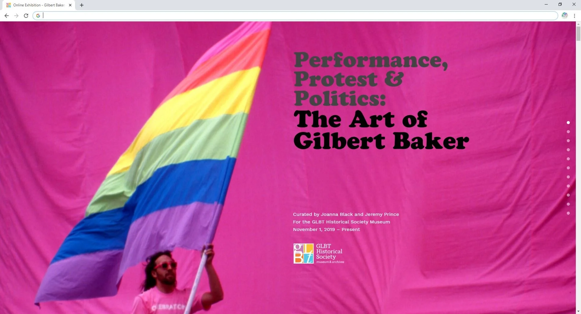 GLBT Historical Society members can attend a preview of our new online exhibition, "Performance, Protest & Politics: The Art of Gilbert Baker." The show, which was previously on display at our Castro museum, has been reimagined for the web to allow people across the world to learn more about Baker's life and work. The exhibition was co-curated by Joanna Black, the former director of archives and special collections at the GLBT Historical Society. She will lead a special guided tour of the online exhibition, explaining her curatorial choices and demonstrating how Baker channeled his artistic skills and larger-than-life personality into his activism, harnessing his unbridled creativity to advocate for positive social change.